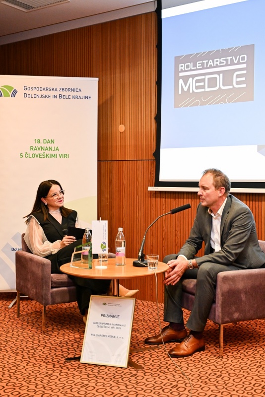 Po strokovnem delu dneva Sekcije za ravnanje s človeškimi viri je sledila, tokrat že osemnajsta svečana podelitev priznanja. Priznanje Vzoren primer ravnanja s človeškimi viri Gospodarske zbornice Dolenjske in Bele krajine za leto 2024 je Tomaž Kordiš, direktor Gospodarske zbornice Dolenjske in Bele krajine, izročil podjetju Roletarstvo Medle.