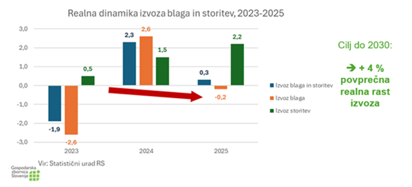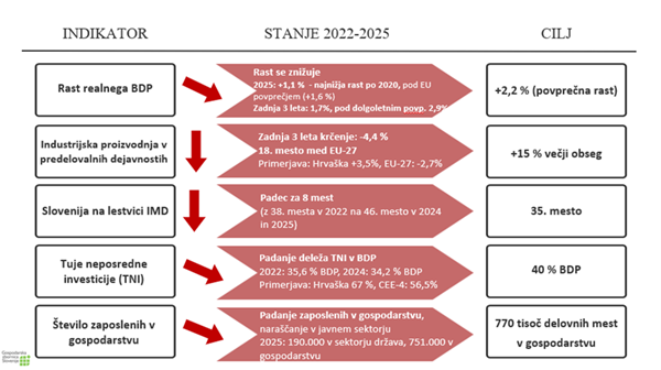 12.3.2026 - Slovensko gospodarstvo je v zadnjih treh letih vstopilo v obdobje izrazitega upočasnjevanja, ki se kaže v padanju gospodarske rasti v zadnjih letih, padcu industrijske proizvodnje, realnem zniževanju dobičkov v večini panog ter slabšanju mednarodne konkurenčnosti, kar se kaže tudi v nizkem deležu tujih neposrednih naložb v BDP. Ob stagnaciji izvoza, upadanju tujih neposrednih investicij in vse večjih stroškovnih pritiskih se zmanjšujejo možnosti podjetij za vlaganja v razvoj in višje plače, kar neposredno vpliva tudi na vzdržnost javnih financ in socialnih sistemov.