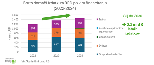 Bruto izdatki za raziskave in razvoj so v zadnjih dveh znanih letih (2024/2022) porasli za 260 mio EUR na 1,46 mrd EUR, kar je posledica povečanja izdatkov pri gospodarskih družbah (+ 90 mio EUR), državi (+ 80 mio EUR) in tujini (+ 80 mio EUR). Dinamika predvsem ugodno vpliva na proizvodnjo visoko tehnološko zahtevnih proizvodov (farmacija, elektroindustrija), še vedno pa so prenizki v drugih dejavnostih, kjer ima Slovenija konkurenčne prednosti. Kot cilj do leta 2030 je Ivanc navedel porast izdatkov na okoli 2,3 mrd EUR letno.