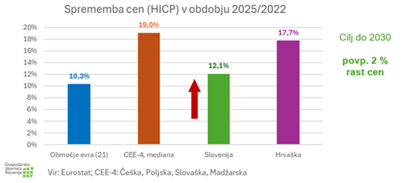 Med 21 državami območja evra je bila rast cen v Sloveniji 8. najvišja. Visoka rast cen je bila posledica učinkov energetske krize na rast plač ter tudi sprememb nekaterih administrativnih delov cen. Nižja 2-odstotna prihodnja rast cen je zaželen cilj, saj inflacija posredno vpliva na gibanja plač v zasebnem sektorju in s tem na konkurenčnost slovenskega izvoznega gospodarstva.