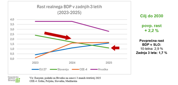 Gospodarska rast v Sloveniji v zadnjih letih pada in je bila lani (1,1 %) najnižja po letu 2020, po prvih ocenah pa je zaostala tudi za evropsko (1,6 %). Povprečna gospodarska rast v zadnjih 3 letih (1,7 %) je bila tudi nižja od povprečne v zadnjem desetletnem obdobju (2,9 %).