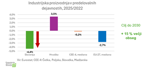 Industrijska proizvodnja v predelovalnih dejavnostih se je v zadnjih treh letih skrčila za – 4,4 %, kar je Slovenijo uvrstilo na 18. mesto med EU-27. Razlog za negativne trende v Sloveniji je v oteženih pogojih poslovanja, povezanih z visokimi stroški energije in stroški dela ter težavami domače avtomobilske industrije. Padec industrijske proizvodnje negativno vpliva na investicije v industriji, na število delovnih mest in dinamiko razvoja industrije.