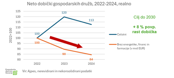 Realni dobički v podjetjih v večini gospodarskih panog, ki ustvarijo 91 % celotne dodane vrednosti gospodarstva, so se v obdobju 2022-24 znižali za 16 %. GZS ocenjuje, da se je zniževanje nadaljevalo tudi v letu 2025, saj so bili prilivi iz naslova davka na dohodek pravnih oseb po podatkih Fiskalnega sveta nižji za desetino. Visoke dobičke beležijo le panoge energetike, financ in farmacije. Cilj do leta 2030 bi moral biti letno rast dobička dvigniti na 8 %, saj bi to predstavljalo zdravo rast, ki odraža izboljšano poslovanje družb, tudi v dejavnostih, ki so bile v zadnjih treh letih še posebej prizadete zaradi upada poslovanja.
