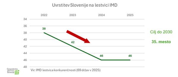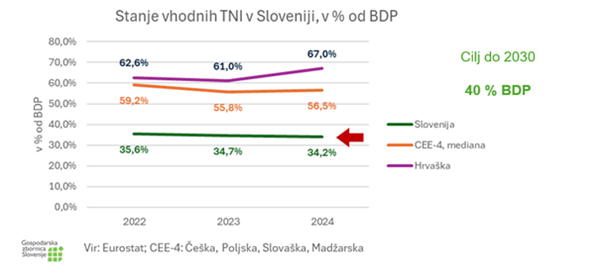 Nizka uvrstitev Slovenije na lestvici konkurenčnosti IMD (padec z 38. mesta v 2022 na 46. mesto v 2024 in 2025) odraža slabšo privlačnost okolja za zasebne investicije, kar potrjujejo podatki o tujih neposrednih investicijah (2022: 35,6 %, 2024: 34,2 %) v primerjavi s srednjeevropskimi državami (dobrih 56 %) ali Hrvaško (67 %). Cilj bi moral biti, da bi Slovenija postala bolj privlačna za t. i. ‘greenfield’ investicije, ki jih primanjkuje zlasti zaradi dolgih in zapletenih postopkov umeščanja v prostor in pridobivanja okoljskih in drugih dovoljenj. Večino tujih investicij v Sloveniji so namreč v zadnjih desetletjih predstavljali prevzemi obstoječih podjetij (npr. Fraport, Helios, Gorenje) ali pa širitve proizvodnje obstoječih družb (Lek v Lendavi, Yaskawa v Ribnici), ne pa nove investicije (t. i. greenfield, kot npr. tovarna Magna).