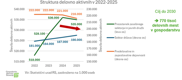 V zadnjih treh letih je število delovno aktivnih v predelovalnih in zaposlovalnih dejavnostih za dobrih 6 tisoč upadlo, medtem ko je istem obdobju v sektorju država naraslo za prek 8 tisoč. V preostanku zasebnega sektorja in državnih družbah pa je zaposlenost do leta 2024 naraščala, v 2025 pa se je rahlo znižala. Ivanc je pojasnil, da je število delovnih mest ključen indikator vzdržnosti slovenskih javnih financ in pokojninskega sistema, ki še vedno pretežno temelji na prvem pokojninskem stebru. Za zagotavljanje vseh pravic je potrebno ohraniti ali povečati število delovnih mest v gospodarstvu in spodbuditi izvozno gospodarstvo, da bo lahko povečalo produktivnost. Cilj do 2030 je okrepiti število delovnih mest v gospodarstvu na 770 tisoč, kar je 20 tisoč več od trenutnega števila.